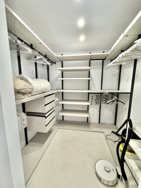 Compartimentarea este eficientă și funcțională: living generos și luminos cu bucătărie open-space, dormitor matrimonial spațios, baie cu duș walk-in și hol de intrare bine organizat. Apartamentul beneficiază de spații ample de depozitare și dressinguri realizate la standarde înalte, unul dintre acestea fiind realizat în Italia.